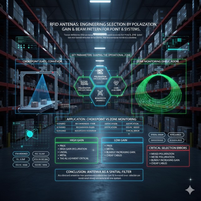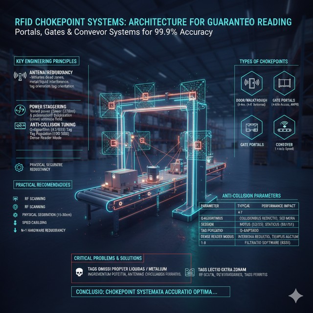 Pattern "Chokepoint": Used for guaranteed reading at a narrow point (gate, conveyor). The architecture is built around redundancy: several readers and antennas configured for mutual overlap of zones. Critical are the calculation of power echeloning and filtering of multiple reads of the same tag.